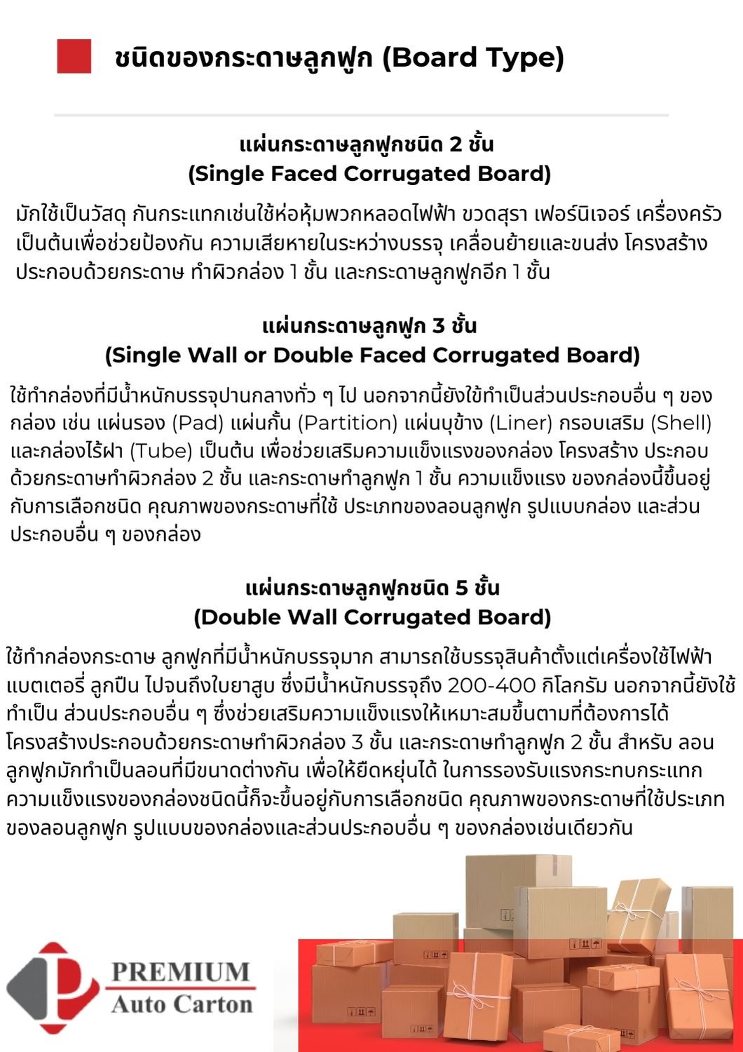 บริษัท พรีเมี่ยมออโต้คาร์ตัน จำกัด เป็นบริษัทผลิตกล่องกระดาษลอนลูกฟูก ผลิตกล่องกระดาษแข็งลอนลูกฟูก ผลิตกล่องจากกระดาษแข็ง